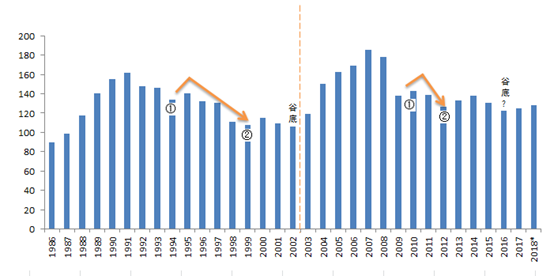 目前来看,两个周期的价格波动幅度大致相当,但下跌阶段表现出明显的不同之处。前一个周期价格呈现逐年下跌态势,持续11年时间,年度跌幅相对平均;而本周期仅用一年(2009年)时间就释放22%的跌幅,用四年时间(到2012年)释放几乎全部33%的跌幅,价格快速下跌后多年处于停滞徘徊阶段。